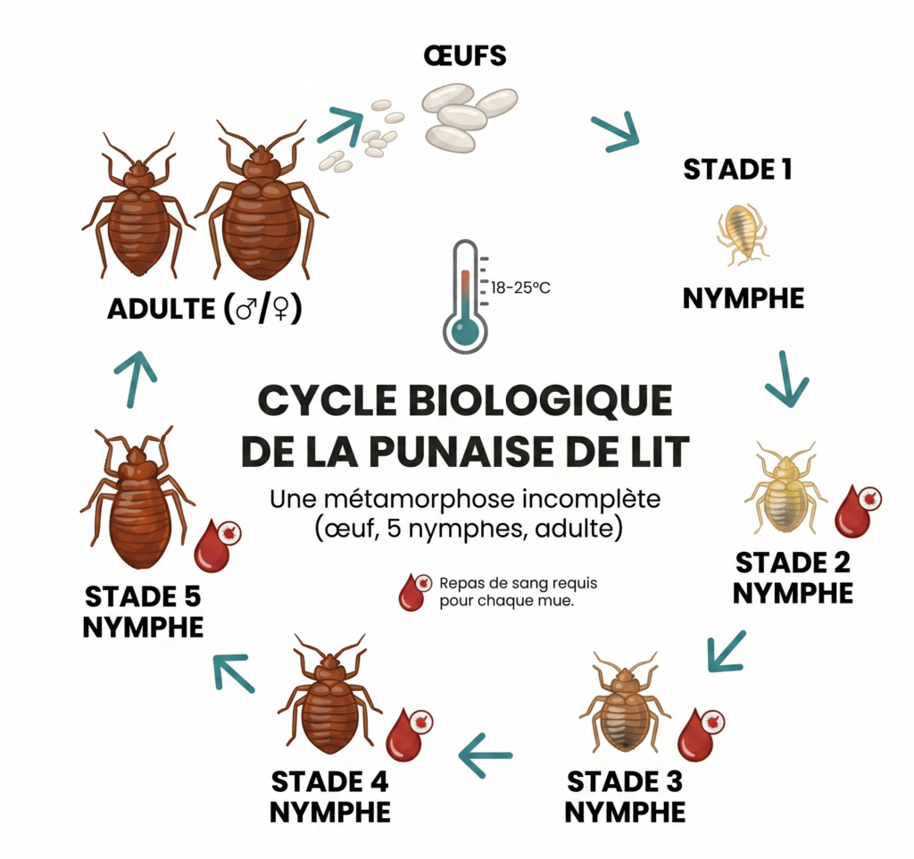 Après l’éclosion, la punaise passe par 5 stades de développement (nymphes) avant d’atteindre l’âge adulte. Ce cycle complet peut durer quelques semaines à plusieurs mois (entre 40 et 72 jours), selon les conditions et la fréquence des repas sanguins. Chaque stade nécessite un repas de sang pour évoluer. Ce délai est extrêmement sensible à la chaleur : il ne faut que 3 semaines à 30°C pour compléter ce cycle, alors qu’il peut s’étendre jusqu’à 11 mois à 18°C.